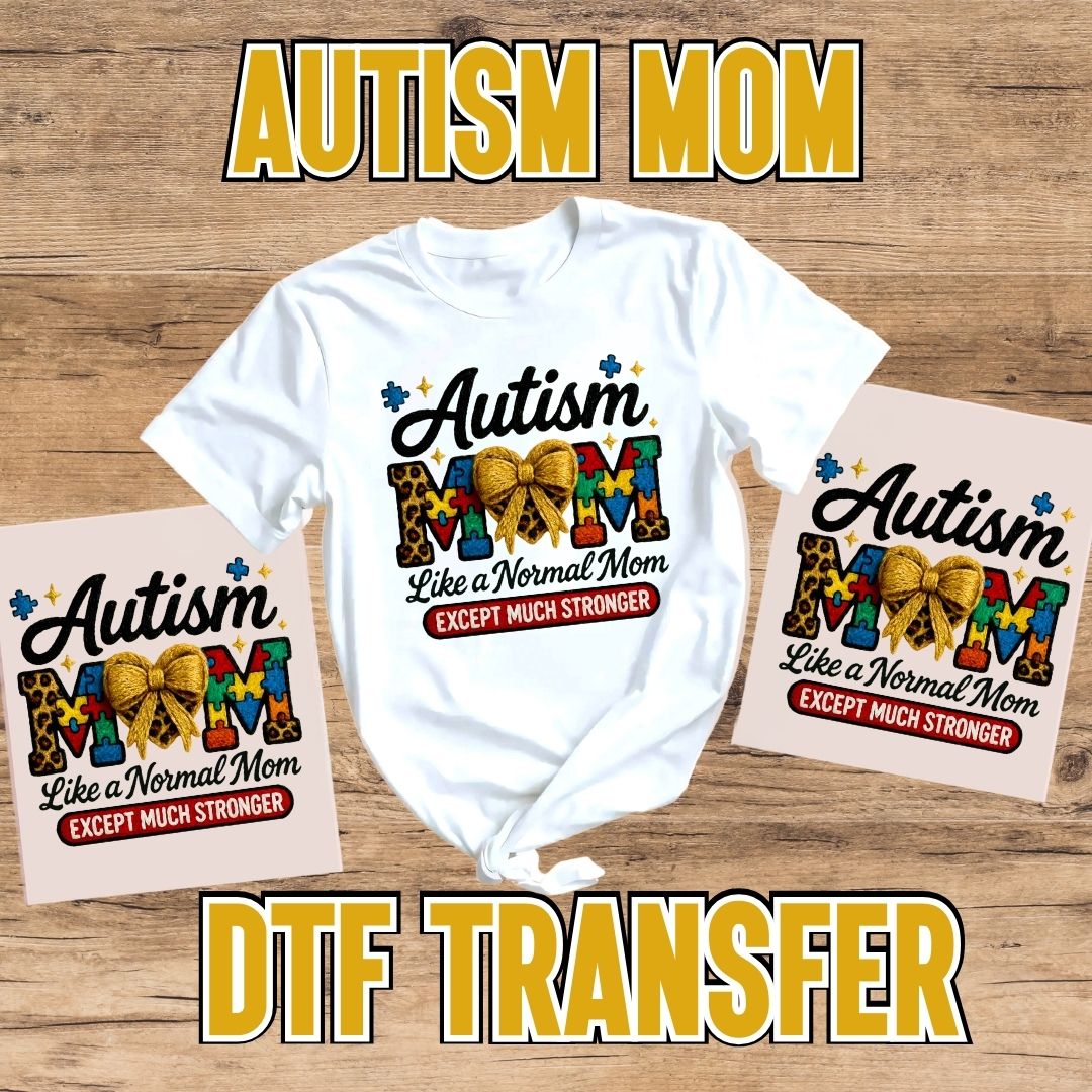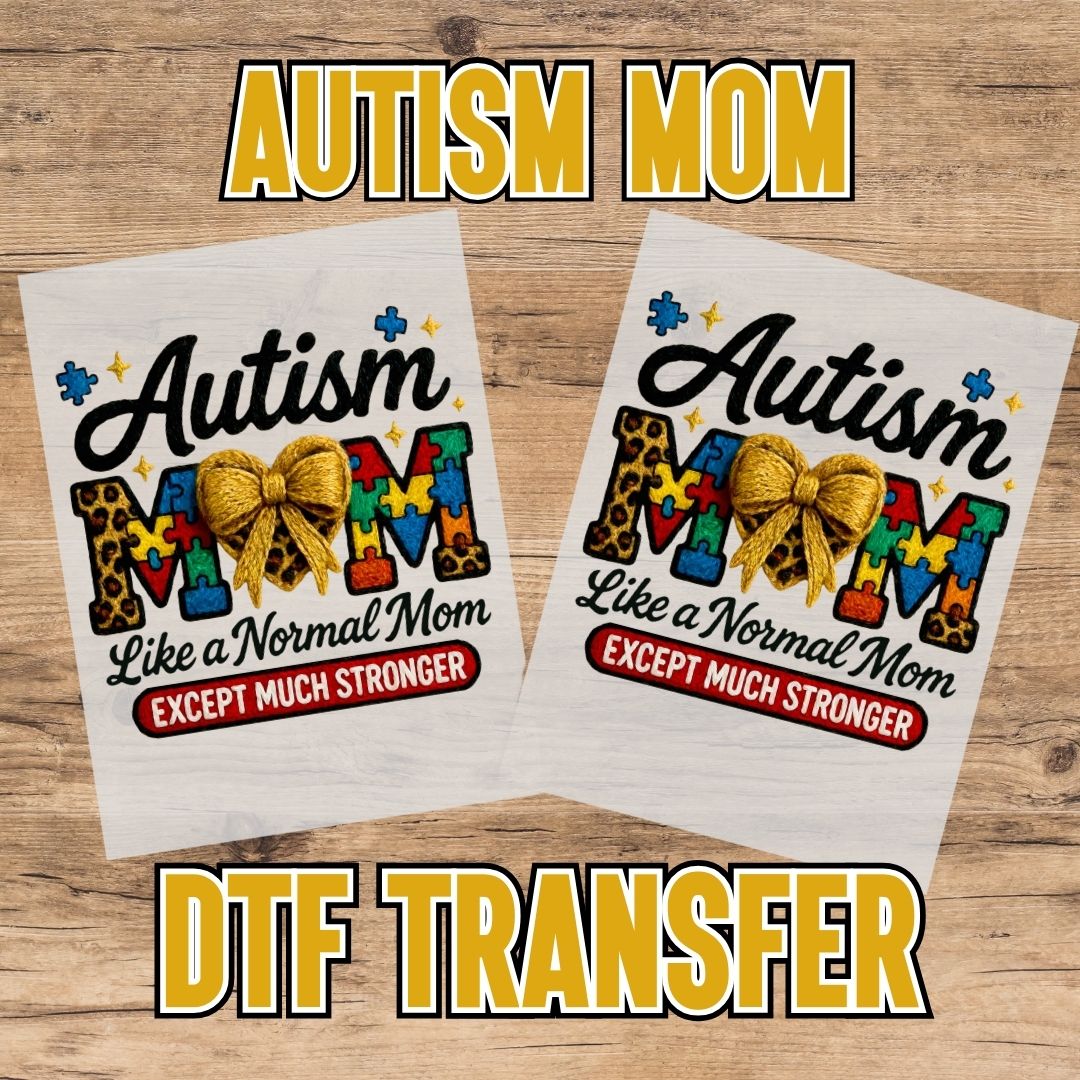 Honor the strength behind the title with our “Autism Mom” DTF Transfer—a bold, vibrant design that reads: “Autism Mom, Like a Normal Mom but Much Stronger.” Created to celebrate the moms who advocate, protect, and love fiercely, this transfer represents the everyday courage it takes to navigate appointments, school meetings, therapies, tough days, big wins, and everything in between—while still showing up with patience, faith, and unconditional love.